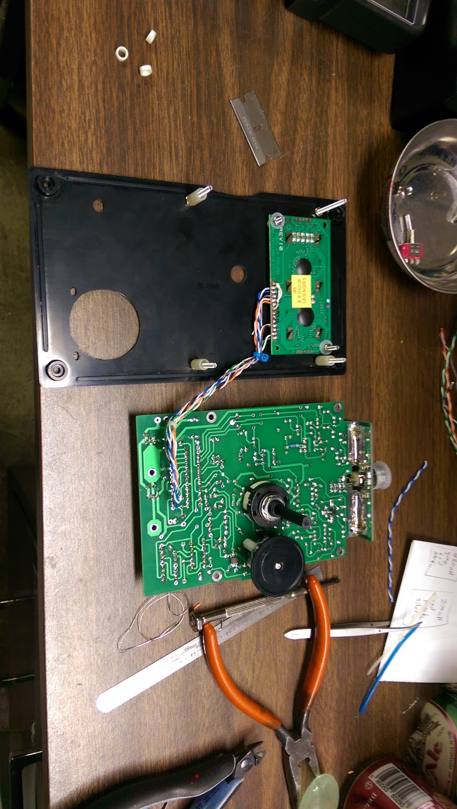 The board was then test-mounted to the front panel to check the spacing. 21mm listed in the instructions wasn't quite the right reference point. I determined the actual distance based upon the thumb wheel clearance to the front panel. The measurement was actually 21mm from the nut securing the bolt to the front panel with reference to the board's track surface.